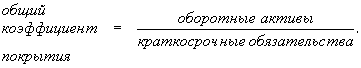 По оценкам, принятым в международной практике, значение коэффициента должно быть 0,8 - 1. 3. Общий коэффициент покрытия, который часто называют просто коэффициентом покрытия, дает общую оценку платежеспособности предприятия. Коэффициент покрытия представляет интерес для покупателей и держателей акций и облигаций предприятия. Его вычисляют по формуле