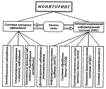 Рис.1. Схема мониторинга В состав мониторинга входят: · наблюдение за изменением качества окружающей среды, факторами, воздействующими на окружающую среду; · оценка фактического состояния природной среды; · прогноз изменения качества среды. Наблюдения осуществляются по физическим, химическим и биологическим показателям. Перспективны интегрированные показатели состояния окружающей среды. В систему экологических наблюдений входит определение показателей опасного загрязнения среды техногенного происхождения, например, соединений тяжелых металлов, газовых загрязнителей и т. д. При разработке проекта экологического мониторинга необходима следующая информация: · выбросы загрязняющих веществ в атмосферу промышленными, энергетическими, транспортными и другими объектами; · сбросы сточных вод в водные объекты; · поверхностные смывы загрязняющих и биогенных в поверхностные воды суши и моря; · внесение на земную поверхность и(или) в почвенный слой загрязняющих и биогенных веществ вместе с удобрениями и ядохимикатами при сельскохозяйственной деятельности; · места захоронения и складирования промышленных и коммунальных отходов; · техногенные аварии, приводящие к выбросу в атмосферу опасных веществ и(или) разливу жидких загрязняющих и опасных веществ, и т.д.; · процессы атмосферного переноса загрязняющих веществ; · процессы переноса и миграции загрязняющих веществ в водной среде; · миграция загрязняющих веществ по почвенному профилю до уровня грунтовых вод; · миграция загрязняющих веществ по ландшафтно-геохимическому сопряжению с учетом геохимических барьеров и биохимических круговоротов. Экологический мониторинг – это серьезная и сложная проблема. Выделяют глобальный, национальный, региональный и локальный мониторинги. Глобальный (биосферный) мониторинг осуществляется на основе международного сотрудничества, позволяет оценить современное состояние всей природной системы Земли. Наблюдение ведут базовые станции в различных регионах планеты (30—40 сухопутных и более 10 океанических). Нередко они располагаются в биосферных заповедниках. Национальный мониторинг осуществляется в пределах государства специально созданными органами. Региональный мониторинг осуществляется за счет станций системы, куда поступает информация в пределах крупных районов, интенсивно осваиваемых народным хозяйством, а следовательно, подверженных антропогенному воздействию. К локальному мониторингу относятся наблюдения за воздушной средой различных зон города, промышленных и сельскохозяйственных районов и отдельных предприятий. Локальный мониторинг осуществляется с помощью стационарных, передвижных или подфакельных постов. Такая система имеется в большинстве крупных городов России. Так, в г. Кургане мониторинг атмосферного воздуха осуществляется на пяти постах. И. П. Герасимов (1981) подразделяет систему наземного мониторинга окружающей среды на блоки, имеющие свои задачи и базу обеспечения (табл.1). Таблица 1 Система наземного мониторинга окружающей среды (по И. П. Герасимову, 1981 г.)