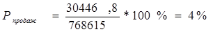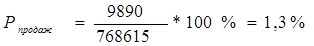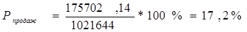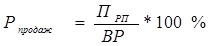 где Прп – прибыль от реализации продукции; Срп – полная себестоимость реализации продукции (товаров). Иногда при расчетах данного показателя в числителе используют чистую прибыль предприятия. Но на показатель рентабельности продукции, рассчитанный на основе чистой прибыли, оказывают влияние факторы, связанные со снабженческо-сбытовой и другими видами деятельности предприятия. Кроме этого, на показатель оказывает влияние и налогообложение [33, с.428]. Для осуществления контроля не только за себестоимостью реализованной продукции, но и за изменениями в политике ценообразования рассчитывают показатель рентабельности продаж. Рентабельность продаж Рпродаж , определяется как отношение прибыли от продаж к выручке от реализации (без НДС), показывает, сколько рублей прибыли получено организацией в результате продажи продукции на один рубль выручки: