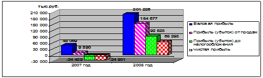 Горизонтальный анализ абсолютных показателей, приведенных в таблице 2.1, показывает, что предприятие в 2008 году добилось высоких финансовых результатов в хозяйственной деятельности по сравнению с 2007 годом. В основном рост прибыли произошел за счет увеличения прибыли от продаж (1464%), определяющими факторами которой явились опережающий рост выручки от реализации на 32,9% по сравнению с производственной себестоимостью за этот же период (13,9%), что свидетельствует о снижении затрат на производство. Прибыль до налогообложения за 2008 год выросла на 116 952 тыс.руб. или 478,7% и составила 92 523 тыс. руб. Увеличение прибыли достигнуто в основном за счет роста выручки и прибыли от продаж. Выручка от продажи товаров, продукции, работ, услуг по сравнению с 2007 годом возросла на 253 029 тыс. руб. или 32,9% и в 2008 г. составила 1 021 644 тыс. руб. Прирост прибыли от продаж за тот же период составил 144 787 тыс. руб, в 2008 году прибыль от продаж составила 154 677 тыс. руб., что в 15,6 раз больше чем в предыдущем 2007 году. Рост данных показателей привело к соответствующему увеличению прибыли, остающейся в распоряжении организации (чистой прибыли). В 2007 году она составляла –24 931 тыс.руб., это означает, что в распоряжении предприятия не осталось прибыли, а появился чистый убыток. В 2008 г. прирост чистой прибыли составил 90 224 тыс.руб. и на конец 2008 г. чистая прибыль составила 65 293 тыс.руб. Показатель же валовой прибыли увеличился на 318,6% в 2008 г. по сравнению с 2007 г. В 2008 г. валовая прибыль составила 201 226 тыс. руб. по сравнению с 2007 г. – 48 069 тыс.руб. Динамика основных показателей прибыли предприятия представлена на рисунке 2.1.