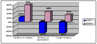Доля чистой прибыли в объеме валовой прибыли в 2008 году уменьшилась и составила 32% по сравнению с 2007 г. – 52%. Доля прибыли до налогообложения в 2008 г. уменьшилась незначительно, в 2007 г. она составляла 51%, в 2008 г. – 46%. Доля прибыли от продаж в 2007 году составляла 21%, а в 2008 г. она выросла до 77%. По данным таблицы 2.1 построим график (рисунок 2.2).