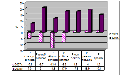 Рентабельность внеоборотных активов: 2007 г.: 2008 г.: Рентабельность оборотных активов: 2007 г.: 2008 г.: Рентабельность собственного капитала: 2007 г.: 2008 г.: Рентабельность основной деятельности: 2007 г.: 2008 г.: Рентабельность реализованной продукции: 2007 г.: 2008 г.: Рентабельность продаж: 2007 г.: 2008 г.: Рассчитанные показатели рентабельности сведем в таблицу 2.6. Таблица 2.6. – Динамика показателей рентабельности ОАО «ВК и ЭХ»