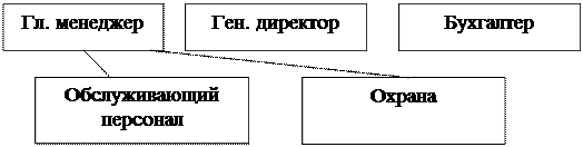 Исходя из этого, для создания бильярдного клуба планируется взять кредит в размере 3546750 рублей сроком на 4 года под 20% годовых. Кредит берётся для покрытия следующих первоначальных затрат: 1. Арендные платежи за 4 месяца 640000 руб. 2. Затраты на приобретение основного и дополнительного оборудования 1135000 + 356400= 1491400 руб. 3. Затраты на ремонт 1000000 руб. 4. Затраты на рекламу за 1,5 месяца 23250 руб. 5. Затраты на приобретение товаров для бара за первый месяц 392100 руб. 2.5 Организационный план Организационная структура управления клубом будет выглядеть следующим образом: Схема 1