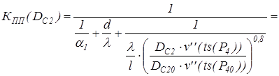 Расчет температуры пара за промперегревателем произведём исходя из уравнения теплового баланса в промперегревателе: K(DC2 ). D t= DC2 . (tПП – ts(PС2 )) , где K(DC2 ) – коэффициент теплопроводности для ПП;D t – среднелогарифмический перепад температур в ПП; DC2 – расход пара на ПП; ts(PС2 ) – температура пара на входе в ПП;tПП – температура пара на выходе из ПП. Коэффициент теплопередачи найдём по формуле: