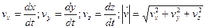 Из этого определения следует, что скорость в каждой точке траектории направлена по касательной к ней. Из (1.5) следует, что проекции и модуль вектора скорости определятся выражениями: