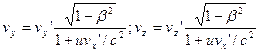 Эта формула выражает релятивистский закон сложения скоростей. Сравнивая (5.9) с (5.2), видно, что при малых скоростях