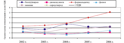 Данные регулярных наблюдений показывают, что уровень загрязнения атмосферного воздуха на территории Нижнего Тагила остается очень высоким. Кроме того, в городе отмечено повышенное среднегодовое содержание аммиака, фенола, и диоксида азота. Средние за 2006 год концентрации бенз(а)пирена и формальдегида были выше 1,0 ПДК. Значения комплексного ИЗа и значение стандартного индекса СИ были в 2006 году также очень высокими, и составили, соответственно, 16 и 12. Значение наибольшей повторяемости превышений ПДК (параметр НП) в городе было высоким, и определялось наибольшей повторяемостью превышений ПДК аммиака (23%). За последние 5 лет наметилась тенденция роста загрязнения атмосферного воздуха диоксидом серы, оксидом углерода, оксидами азота, аммиаком, фенолом, формальдегидом, цианидом водорода, бенз(а)пиреном, никелем и хромом. Концентрации взвешенных веществ, сероводорода, бензола, ксилола, толуола, этилбензола, железа, марганца, меди, свинца и цинка снизились. На рисунке 7.1 представлена динамика среднегодовых концентраций приоритетных загрязняющих веществ атмосферы. Динамика среднегодовых концентраций приоритетных загрязняющих веществ атмосферы