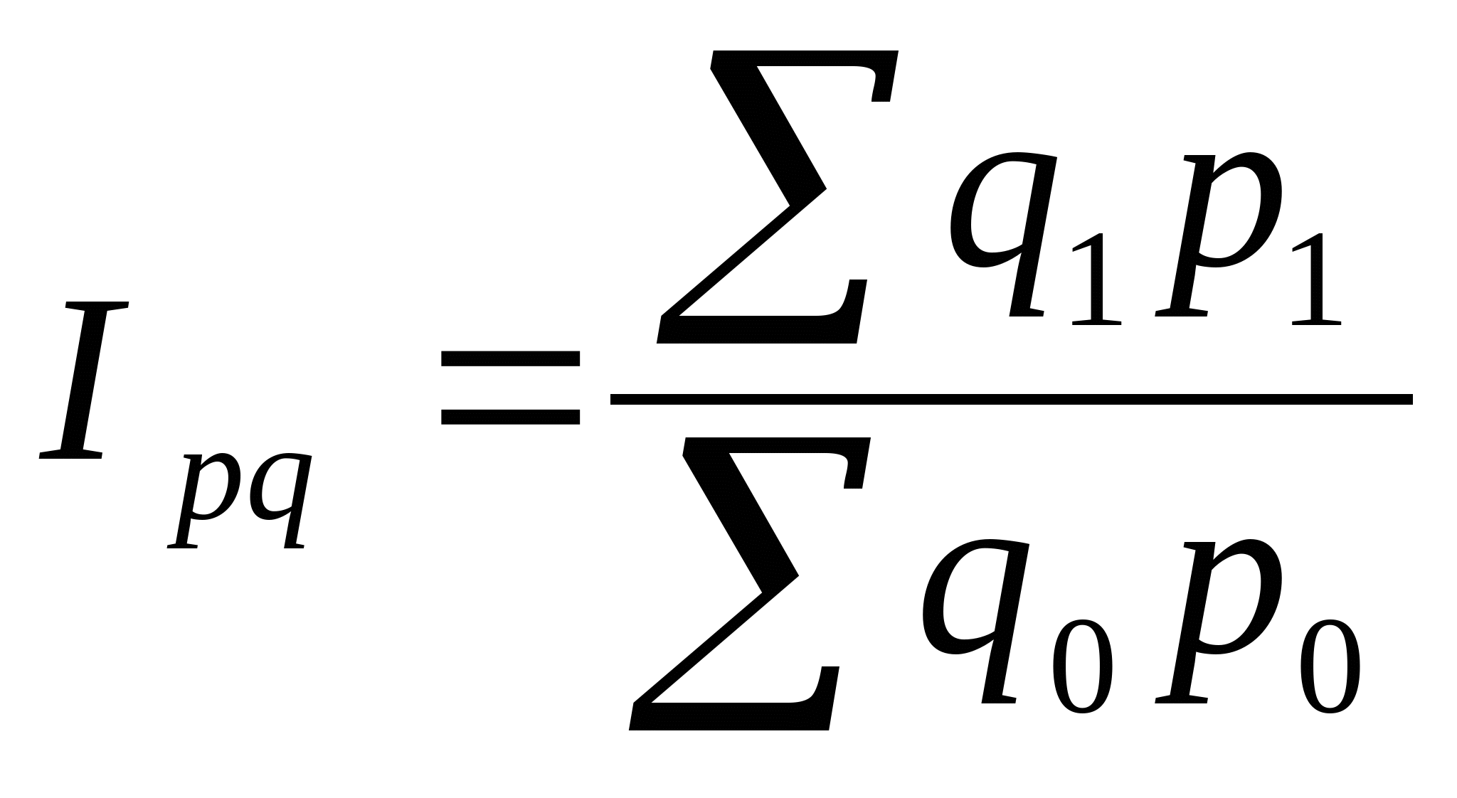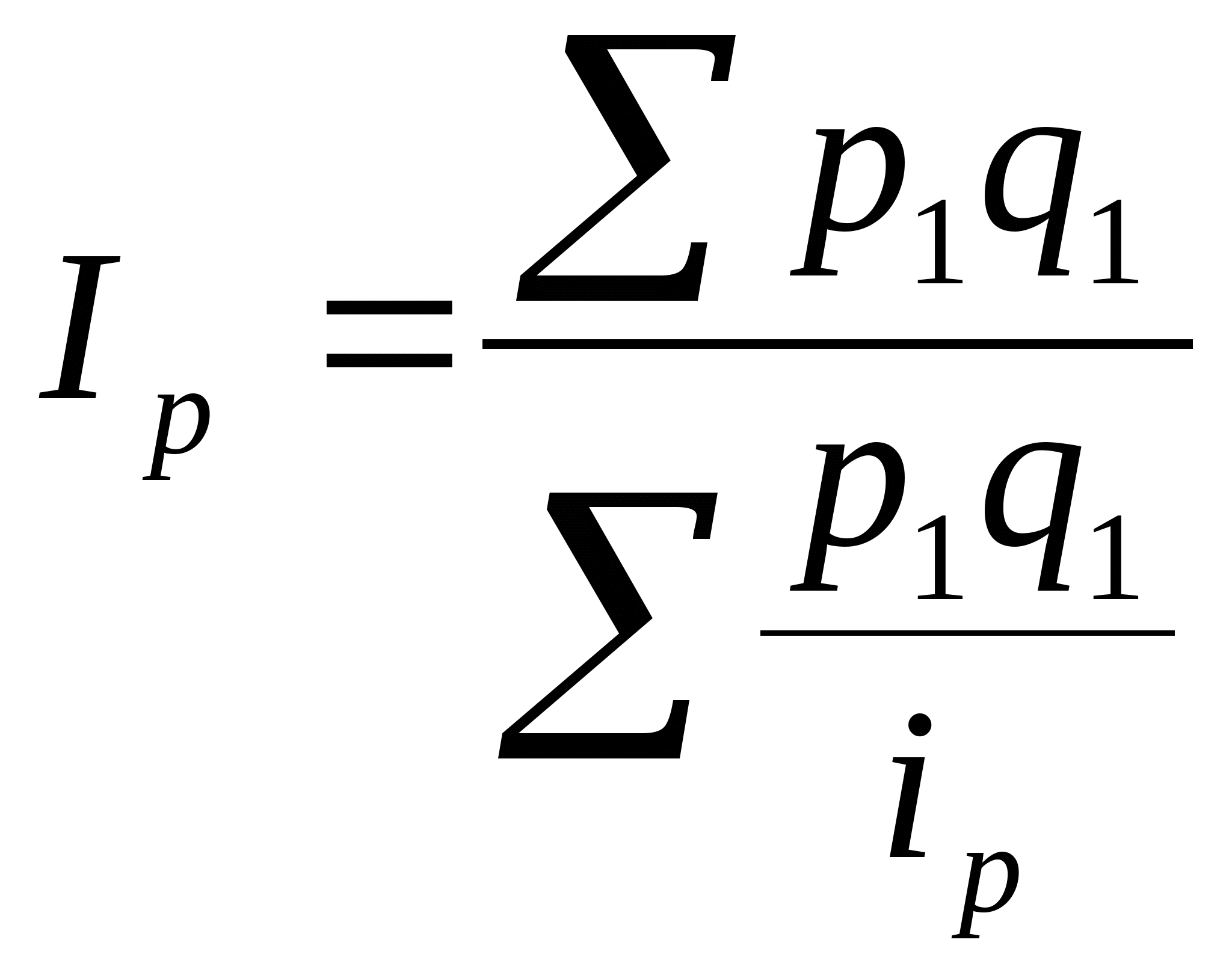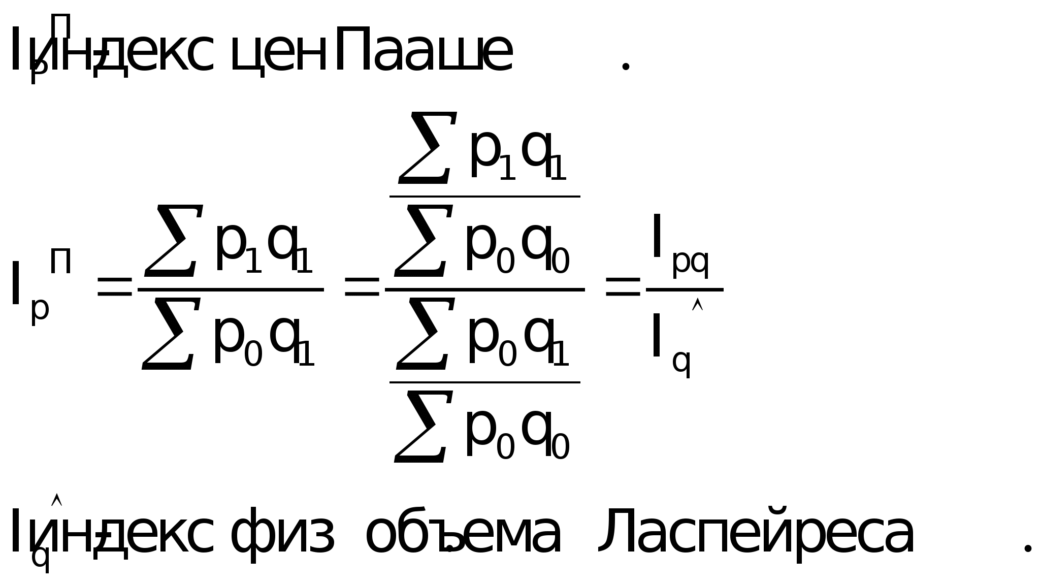 Синтетическая. Согласно синтетической концепции особенность общих индексов состоит в том, что выражают относительные изменения сложных разных товарных явлений, отдельные части или элементы которых несоизмеримы, и поэтому такие индексы – показатели синтетические. Аналитическая. В аналитической теории индексы трактуются как показатели, необходимые для измерения влияния изменения составных частей, компонентов, факторов сложного явления на изменение уровней этого явления. Поэтому индексная методология предусматривает определенные влияния каждого из факторов путем элиминирования влияния других факторов на уровень изучаемого явления. Таким образом, общие индексы являются одновременно и синтетическими и аналитическими. Общие индексы строят для количественных (объёмных) и качественных показателей. В зависимости от цели исследования и наличия исходных данных используют различные формы построения общих индексов: Агрегатная форма; Средневзвешенная форма. Агрегатная форма общего индексаАгрегатный индекс – это сложный относительный показатель, который характеризует среднее изменение социально-экономического явления, состоящего из несоизмеримых элементов. Особенностью этой формы индекса является то, что в агрегатной форме сравниваются две суммы одноимённых показателей. В настоящее время это наиболее распространённая форма индексов, используемая в практической статистике многих стран. Числитель и знаменатель агрегатного индекса представляют собой сумму произведений двух величин, одна из которых меняется (индексируемая величина), а другая остаётся неизменной в числителе и в знаменателе (вес индекса). Индексируемой величиной называется признак, изменение которого изучается. Вес индекса – это величина служащая для целей соизмерения индексируемых величин. При выборе веса индекса, принято руководствоваться следующим правилом: если строится индекс количественного показателя, то веса берутся за базисный период. А при построении индекса качественного показателя, используются веса за отчётный период. Однако вводимые в дальнейшем индексы можно строить с использованием веса как за базисный период, так и за отчётный период. С этой точки зрения индексы можно разделить на две группы: Индексы, при вычислении которых используются веса базисного периода (формула Лайспереса); Индексы, при вычислении которых используются веса отчётного периода (формула Пааше). Основные формулы для исчисления сводных или общих индексов.