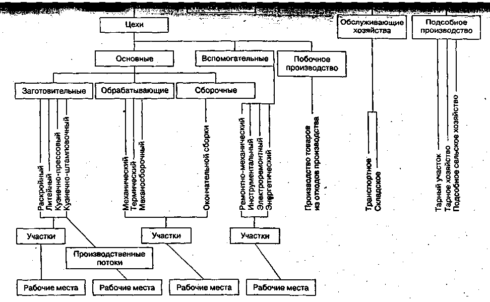 OBE – обш. выгода при сов. конкур. OBCF – общ. выгода при монополии C S A E F D MR О монополист способен устанавливать ценовую дискриминацию покупателя (продавать товар разным покупателям / группам по разной цене). При этом увеличивается выгода (излишек) монополиста, уменьшается выгода (излишек) у покупателей Производственная структура предприятия Необходимым условием эффективной деятельности предприятия является рациональное построение организационной, производственной и управленческой структуры. Производственная структура предприятия – состав образующих его участков, цехов и служб, формы их взаимосвязи в процессе производства продукции. характеризует разделение труда между подразделениями предприятия и их кооперацию оказывает существенное влияние на технико-экономические показатели производства, на структуру управления предприятием, организацию оперативного и бухгалтерского учета. динамична. По мере совершенствования техники и технологии производства, управления, организации производства и труда совершенствуется и производственная структура. Совершенствование производственной структуры создает условия для интенсификации производства, эффективного использования трудовых, материальных и финансовых ресурсов, повышения качества продукции. В отличие от производственной структуры общая структура предприятия включает различные общезаводские службы и хозяйства, в том числе и связанные с культурно-бытовым обслуживанием работников предприятия (жилищно-коммунальное хозяйство, столовые, больницы, поликлиники, детские сады и т.п.). Элементы производственной структурыГлавными элементами производственной структуры предприятия являются рабочие места, участки и цехи. Первичным звеном пространственной организации производства является рабочее место. Рабочим местом называется неделимое в организационном отношении (в данных конкретных условиях) звено производственного процесса, обслуживаемое одним или несколькими рабочими, предназначенное, для выполнения определенной производственной или обслуживающей операции (или их группой), оснащенное соответствующим оборудованием и организационно-техническими средствами. Простое рабочее место характерно для производства дискретного типа, где один работник занят использованием конкретного оборудования. Простое рабочее место может быть одно- и многостаночным. В случае использования сложного оборудования и в отраслях с использованием аппаратных процессов рабочее место становится комплексным, так как обслуживается группой людей (бригадой) с определенным разграничением функций выполнении процесса. Значение комплексных рабочих мест увеличивается с повышением уровня механизации и автоматизации производства. Стационарное рабочее место расположено на закрепленной производственной площади, оснащенной соответствующим оборудованием, а предметы труда подаются к рабочему месту. Подвижное рабочее место передвигается с соответствующим оборудованием по мере обработки предметов труда. В зависимости от особенностей выполняемых работ рабочие места подразделяются на специализированные и универсальные От уровня организации рабочих мест, обоснованного определения их количества и специализации, согласования их работы во времени, рациональности расположения на прои