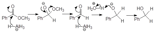 Для восстановления сложных эфиров боргидрид натрия мало пригоден, поэтому используют алюмогидрид лития. Алюмогидрид лития очень реакционноспособен и с водой и спиртами реагирует со взрывом. Поэтому восстановление с его помощью ведут в безводных эфирах.