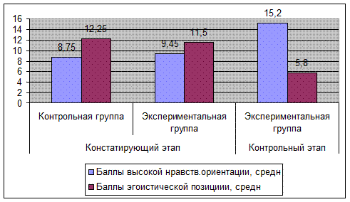 Следует отметить, что после проведения формирующей работы баллы существенно изменились. Как у мальчиков так и у девочек значительно увеличились баллы высокой нравственной ориентации. Наглядно изменения по средним баллам представлены на рис. 2.1