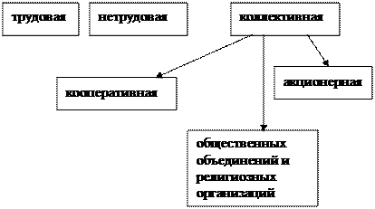 Частная собственность — тип собственности, при которой исключительное право на владение, распоряжение и пользование объектом собственности и получение дохода имеет частное лицо. Характерный признак ее — передача имущества по наследству. Она создается и умножается за счет предпринимательской деятельности, ведения собственного хозяйства, доходов от средств, вложенных в акции, облигации, кредитные учреждения. Ее объектами являются жилые дома и квартиры, денежные средства, ценные бумаги, предприятия, другое имущество. Формы частной собственности • трудовая — в основе лежит труд самого собственника, развивается и приумножается от предпринимательской его деятельности, ведения собственного хозяйства и других форм; • нетрудовая — не связана с трудовой деятельностью собственника, получает имущество по наследству, дивиденды от акций, облигаций и других ценных бумаг, доходы от средств, вложенных в кредитные учреждения, и других источников, не связанных с трудовой деятельностью. Общественная собственность — тип собственности, при которой средства производства, его результаты и имущественные ценности являются совместным достоянием. Коллективная собственность — форма общественной собственности, при которой вещи, материальные и духовные ценности принадлежат определенному коллективу. Формы коллективной собственности: • кооперативная (партнерская) — являющаяся достоянием членов кооператива, объединивших средства и труд для совместной деятельности; • акционерная — включающая финансовый капитал от продажи акций и облигаций, а также средства от хозяйственной деятельности; • общественных объединений и религиозных организаций — возникшая за счет собственных средств, пожертвований, а также передачи государством имущества. Государственная собственность — форма общественной собственности, являющаяся достоянием всех людей страны. Формы государственной собственности: • республиканская — достояние граждан страны (земля, ее недра, республиканские банки, средства госбюджета, предприятия, учебные заведения, другое имущество); • муниципальная (коммунальная) - имущество ассоциации граждан области, района (средства местного бюджета, жилищный фонд предприятия торговли и бытового обслуживания, транспорт, промышленные и строительные предприятия, учреждения народного образования, культуры и другое имущество). В соответствии с Законом о собственности в Республике Беларусь допускается существование собственности других государств, их физических и юридических лиц, а также собственности международных организаций. В последнее время все большее значение приобретает интеллектуальная собственность. Интеллектуальная собственность - результаты интеллектуальной деятельности (литературные, художественные и научные произведения, исполнительская актерская деятельность, создание и присвоение информации). 3. Разгосударствление и приватизация собственности. Переход к рыночной экономике может быть осуществлен только на базе изменения отношений собственности. Разгосударствление — передача от государства другим субъектам частично или полностью функций прямого хозяйственного управления, замена вертикальных связей горизонтальными, т.е. между самими предприятиями. Цели разгосударствления: • преодоление монополии государ