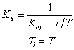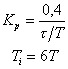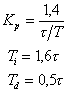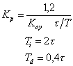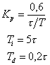 где – Теоретически, в системе с запаздыванием, минимальное время регулирования Руководствуясь таблицей можно утверждать, что наибольшее быстродействие обеспечивает П-закон управления. Однако, если коэффициент усиления П-регулятора Наиболее распространенным на практике является ПИ-регулятор, который обладает следующими достоинствами: 1. Обеспечивает нулевую статическую ошибку регулирования; 2. Достаточно прост в настройке, т. к. настраиваются только два параметра, а именно коэффициент усиления Для наиболее ответственных контуров можно рекомендовать использование ПИД-регулятора, обеспечивающего наиболее высокое быстродействие в системе. Обнако следует учитывать, что это условие выполняется только при его оптимальных настройках (настраиваются три параметра). С увеличением запаздывания в системе резко возрастают отрицательные фазовые сдвиги, что снижает эффект действия дифференциальной составляющей регулятора. Поэтому качество работы ПИД-регулятора для систем с большим запаздыванием становится сравнимо с качеством работы ПИ-регулятора. Кроме этого, наличие шумов в канале измерения в системе с ПИД-регулятором приводит к значительным случайным колебаниям управляющего сигнала регулятора, что увеличивает дисперсию ошибки регулирования и износ исполнительного механизма. Таким образом, ПИД-регулятор следует выбирать для систем регулирования, с относительно малым уровнем шумов и величиной запаздывания в объекте управления. Примерами таких систем является системы регулирования температуры. При выборе типа регулятора рекомендуется ориентироваться на величину отношения запаздывания к постоянной времени в объекте 6.3 Формульный метод определения настроек регулятора Метод используется для быстрой, приближенной оценки значений параметров настройки регулятора для трех видов оптимальных типовых процессов регулирования. Метод применим как для статических объектов с самовыравниванием (таблица 2.2), так и для объектов без самовыравнивания (таблица 2.3). Таблица 5.