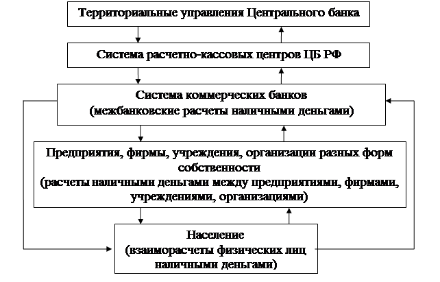 Рис.1. Схема налично-денежного оборота (на примере России) Из схемы видно, что налично-денежный оборот начинается в расчетно-кассовых центрах Центрального банка РФ. Наличные деньги переводятся из их резервных фондов в оборотные кассы, тем самым они поступают в обращение. Из оборотных касс РКЦ наличные деньги направляются в операционные кассы коммерческих банков. Часть этих денег обслуживает межбанковские расчеты, часть – направляется в качестве кредитов другим банкам, но большая часть наличных денег выдается клиентам – юридическим и физическим лицам (либо в кассы предприятий и организаций, либо непосредственно населению), обслуживаемым в данном коммерческом банке. Часть наличных денег, находящихся в кассах предприятий и организаций, используется для расчетов между ними, но большая часть передается населению в виде различных видов денежных доходов (заработной платы, пенсий и пособий, стипендий, страховых возмещений, выплаты дивидендов, поступлений от продажи ценных бумаг и т.д.) Население также использует наличные деньги для взаиморасчетов, но большая их часть расходуется на выплату налогов, сборов, страховых платежей, квартплаты и коммунальных платежей, погашение ссуд, покупку товаров и оплату различных платных услуг, покупку ценных бумаг, арендные платежи, уплату штрафов, пени и неустоек и т.д. Таким образом, деньги поступают либо непосредственно в операционные кассы коммерческих банков, либо в кассы предприятий и организаций (прежде всего предприятий торговли и предприятий, оказывающих услуги населению). В соответствии с действующим порядком организации налично-денежного оборота для каждого предприятия устанавливаются лимиты остатка денег в их кассах и деньги, превышающие лимит, должны сдаваться в обслуживающий данное предприятие коммерческий банк. Для коммерческих банков также устанавливаются лимиты их опреационных касс, поэтому в сумме, превышающей лимит, они сдают наличные деньги в РКЦ. Последним также устанавливается лимит их оборотных касс, поэтому деньги в сумме, превышающей лимит, переводятся в резервные фонды, то есть изымаются из обращения. 2. ОРГАНИЗАЦИЯ НАЛИЧНО-ДЕНЕЖНОГО ОБОРОТА Налично-денежный оборот организуется государством в виде центрального банка. Для этого центральный банк систематически издает документ, который называется «Порядок введения кассовых операций в народном хозяйстве». Последний раз этот документ в России издавался в сентябре 1993 г. Налично-денежный оборот организуется на основе следующих принципов: · все предприятия и организации должны хранить наличные деньги (за исключением части, установленной лимитом) в коммерческих банках; · банки устанавливают лимиты остатка наличных денег для предприятий всех форм собственности; · обращение наличных денег служит объектом прогнозного планирования; · управление денежным обращением осуществляется в централизованном порядке; · организация налично-денежного оборота имеет целью обеспечить устойчивость, эластичность и экономичность денежного обращения; · наличные деньги предприятия могут получать только в обслуживающих их учреждениях банков. 3. ДЕНЕЖНЫЕ СИСТЕМЫ, ИХ ФОРМЫ И РАЗВИТИЕ С укреплением государственной власти и образованием рынков в XVI - XVII веках в Европе возникли объективные предпосылки для государственного регулиро