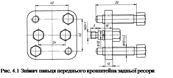 від’єднати амортизатори від підкладок чи ресор зняти їх з автомобіля; підняти задню частину автомобіля для зняття навантаження із шарнірів кріплення ресор; від’єднати ресори від заднього моста; від’єднати ресори від кузова. Для видалення пальця переднього кінця ресори (разом із шайбою) варто користуватися знімачем, показаним на рис.4.1. Вибивати палець ударами молотка не рекомендується щоб уникнути вигину щік кронштейна, ушкодження пальця або ослаблення його посадки в шайбі. При необхідності розбирання ресори потрібно затиснути її в тиски в безпосередній близькості від центрового болта, випрямити відігнуті кінці хомутів і відвернути гайку центрового болта. Щоб уникнути травми лещата варто відпускати обережно, тому що листи в стягнутій ресорі знаходяться під великимнавантаженням. По цій же причині не рекомендується видаляти центровий болт без попереднього затиску листів у лещатах [6]. Зборка ресори і задньої підвіски виконується в зворотному порядку. При цьому потрібно враховувати наступні рекомендації. Короткий кінець ресори повинний бути приєднаний до переднього кронштейна. Гумові втулки ресор не повинні провертатися у вушку ресори і на пальці. Тому при заміні втулок для кращого їх прилипания рекомендується ретельно очистити поверхні вушка і пальця і промити їх бензином. Втулки безпосередньо перед постановкою варто також промити в бензині і, не давши просохнути, змонтувати в шарнір. Гайки пальців потрібно затягувати по черзі щоб уникнути перекосів і вигину щік серги. Щоб при роботі гумові втулки закручувалися приблизно однаково, не слід затягувати гайки пальців при ненавантаженій ресорі. Коли ресора знаходиться у вільному (вигнутому) стані, гайки підтягти тільки злегка, а потім, поставивши автомобіль на колеса, затягти остаточно. Порядок почергового підтягування необхідно дотримувати і при затягуванні гайок стрем’янок. Остаточну затяжку драбин варто робити на навантажених ресорах. Рекомендується задню частину автомобіля навантажити настільки, щоб ресори випрямилися. Затягувати стрем’янки ресор автомобілів ГАЗ-24 відбувається до зіткнення фланців обойм, як показано на рис. 4.2, а. В автомобіля ГАЗ-24-02 стрем’янки варто затягувати до розміру А, рівного 68±1 мм, як показано на рис. 9, б.