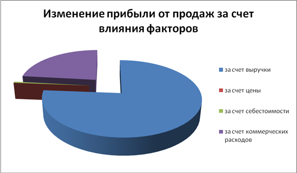 Исходя из данных выводов, следует, что выручка от реализации продукции в отчетном периоде по сравнению с прошлым периодом снизилась за счет снижения цены на 29,789 т.р. Снижение выручки от реализации в отчетном периоде (исключая влияние цены) на 53027,211 т.р. (9929,789 – 62957) обусловило уменьшение суммы прибыли от реализации, а тем самым и прибыли отчетного периода на 6130,93 т.р. Снижение цен на продукцию в отчетном периоде по сравнению с прошедшим периодом привело к снижению суммы прибыли от реализации на 3,4436 т.р. В факторном анализе финансовых результатов определяется также влияние товарооборота (выручки), среднего уровня валового дохода, изменения среднего уровня издержек обращения (себестоимости), среднего уровня коммерческих расходов. 1) ∆Пр(С) = (УРС1 – УРС0 )*В1 /100%, (20) 2) ∆Пр(Кр) = (УКР1 – УКР0 )*В1 /100%, (21) где ∆Пр – изменение прибыли; В1 – выручка за отчетный год; ВП – валовая прибыль; УВП1 , УВП0 – уровень валовой прибыли за отчетный и предыдущий года; (УВП= ВП/C) С – себестоимость; УРС1 , УРС0 – уровень себестоимости за отчетный и предыдущий года; Кр – коммерческие расходы; УКР1 , УКР0 – уровень коммерческих расходов. 1) Расчет влияния фактора «Себестоимость реализации» ∆Пр(С) = (УРС1 – УРС0 )*В1 /100%=9900*(38,28 – 37,88)/100= +39,31389 т.р. Здесь необходимо отметить, что расходы – это фактор обратного влияния по отношению к прибыли. Из таблицы 18 видно, что себестоимость в отчетном периоде снизилась на 20062 т.р., а уровень ее по отношению к выручке от реализации увеличился на 0,39 пункта. Поэтому это привело к уменьшению прибыли на 39,31 т.р. 2) Расчет влияния фактора «Коммерческие расходы» ∆Пр(Кр) = (УКР1 – УКР0 )*В1 /100%=9900*(69,4242 – 50,55)/100= +1868,35 т.р. То есть, перерасход по коммерческим расходам в отчетном периоде и повышение их уровня на 18,87 пункта привел к уменьшению суммы прибыли от реализации на 1868,3557 т.р. Для наглядности представим результаты расчетов в таблице ниже. Таблица 20 – Влияние факторов на изменение прибыли