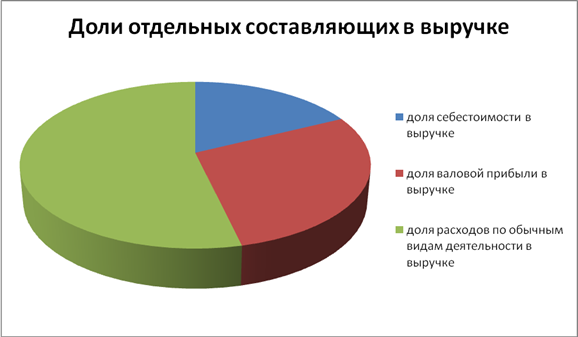 Диаграмма 2 - «Доли отдельных составляющих в выручке» Для оценки влияния изменения составляющих затрат предприятия на изменение рентабельности предприятия по основным видам деятельности воспользуемся трехфакторной моделью вида: Rпр = ПРП : (С+ПОСТ)= (ПРП:В):[(С:В)+(ПОСТ:В)]=x1:(x2+x3), (27) где x1 – рентабельность продаж по прибыли от продаж; x2 – доля себестоимости в выручке; x3 – доля постоянных затрат в выручке. Рассмотрим применение этой модели. Таблица 22 – Динамика факторов, влияющих на рентабельность предприятия по основным видам деятельности