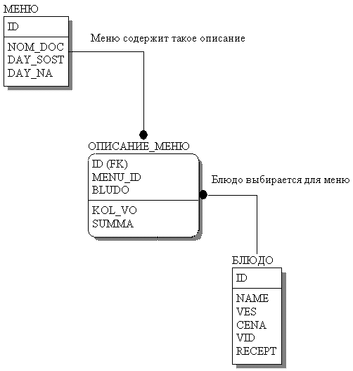 Рис. 2.2 Логическая модель базы данных предметной области «План - меню» Этап 3. Создание физической модели базы данных На этапе рабочего проектирования требуется физическая модель базы данных. При использовании средства моделирования данных ER-Win компании Platinum физическая модель автоматически генерируется для выбранного типа базы данных. Переключение на физический уровень представления модели осуществляется выбором уровня Physical в ниспадающем меню панели инструментов. После выполнения всех операций, физическая модель имеет вид, представленный на рисунке 2.3.