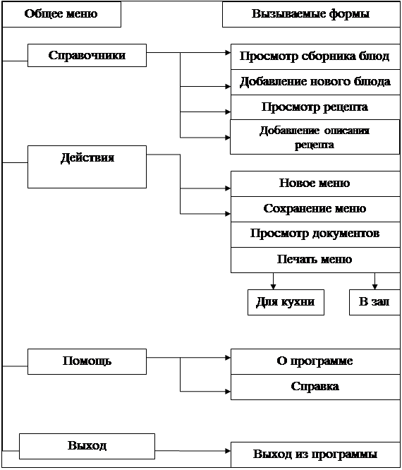 Рис 2.7 Структурная схема меню главной формы. Главная форма системы – «План - меню» содержит меню для доступа ко всем функциям программы, а также компонент DBGrid для отображения данных об описании меню. Форма «Сборник блюд» служит для отображения в сетке DBGrid всех блюд содержащихся в сборнике. Форма «Добавить рецепт» служит для осуществления добавления, удаления и редактирования сборника. Эти действия осуществляются по средствам компонента DBNavigator. Форма «Просмотр текстов рецептов» служит для просмотра рецепта блюда. Форма содержит DBGrid для отображения списка блюд для выбора, поле с текстом рецепта и дополнительную информацию о блюде. Форма «Добавление описания блюда» служит для ввода информации о блюде, точнее его рецепте и составных компонентов. Для перемещения по записям на форме присутствует DBNavigator. Для сохранения введенных данных на форме имеется кнопка принадлежащая второму DBNavigator. Форма «Список документов» служит для отображения всех сохраненных ранее меню. Выбрав какой либо документ, на главной форме в сетке DBGrid автоматически отображается его описание. Для перемещения по записям на форме присутствует DBNavigator. Удаление, сохранение и редактирование документов осуществляется так же через DBNavigator. Форма «Отчет о составленном плане меню для кухни» и «отчет о меню в зал» это печатные формы, содержащие информацию для места их назначения. Форма «О программе» представляет собой стандартную форму AboutBox из набора форм Delphi. Она содержит сведения о разработчике, версии программы и другую служебную информацию. Взаимосвязь между каждой формой и одной или более сущностями показана в таблице 2.8. Табл. 2.8 Связь между формами и сущностями.