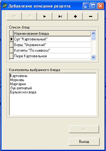 Рис. 2.10 Пункт меню «Просмотр сборника» На этой вкладке расположен визуальный элемент DBGrid, позволяющий пользователю наглядно просматривать состав сборника. Для навигации по записям в нижней части формы расположен элемент DBNavigator. Для выхода из справочника в правом нижнем углу есть кнопка «Выход». - пункт «Добавить новое блюдо» открывает форму, которая имеет следующий вид и функциональность: