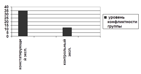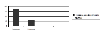 Проанализировав данные, можно сделать вывод, что в экспериментальной группе эмоционально-психологический климат хуже, подростки чаще ссорятся, у них высокая тревожность. Мы считаем, что это связано с психологическими особенностями детей с нарушениями интеллекта. Эти дети эмоционально весьма высокочувствительны, а следовательно, высоковосприимчивы к эмоциональной среде обитания. Вследствие невротизма дети дают сильные эмоциональные всплески даже на незначительные события и обстоятельства. Их эмоции не только насыщены, но и противоречивы и неустойчивы. Такие дети отличаются эмоциональной уязвимостью, ранимостью, что отражается в их оценках. Уровень конфликтности группы выводится из удельного веса отрицательных выборов по отношению к общему количеству сделанных детьми выборов (и положительных, и отрицательных). Так, в нашем случае он составляет (гист.3). Гистограмма 3