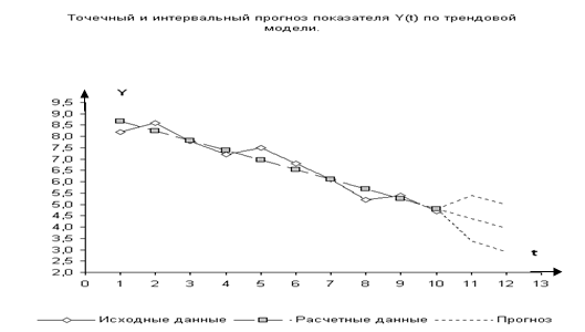 Так как 3,85% < 5%, то точность модели высокая. Задание 6. Точечный прогноз для Y получим, подставляя в трендовую модель t =11 и t = 12.