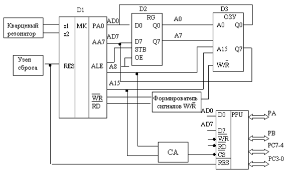 1.2 Структурная схема устройства Система состоит из микроконтроллера i8086, порты которого используются для вывода адреса ОЗУ, подключен адаптер параллельного интерфейса i8255. Взаимодействие микроконтроллера с внешней памятью и периферийными устройствами осуществляется по шине адреса. Данные передаются и принимаются микроконтроллером по шине данных. Управляющие сигналы передаются по шине управления. ОЗУ подключены своими адресными входами к шине адреса и передают и принимают данные по шине данных. Адрес формируется на контактах портов РА – 8 младших разрядов и РС – старшие разряды. Обмен данными с ОЗУ микроконтроллер осуществляет через порт РА. Поэтому младшие разряды адреса на время обмена сохраняются на время обмена в регистре-защелке. Структурная схема устройства приведена ниже на рис.1.