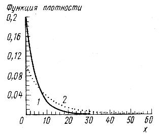 Рис. 3. Функція щільності f (x ) експоненційного розподілу: (1) Q =0.2, (2) Q =0.1 Для побудови моделі СМО виконуємо наступні дії: Як було сказано раніше ми будемо використовувати СМО у якості нашої моделі. Стани СМО ми будемо описувати за допомогою формул, що будуть надані нище. Побудуємо нашу СМО у вигляді графа, що зображено на рисунку 4: l0 l1 ln-1
