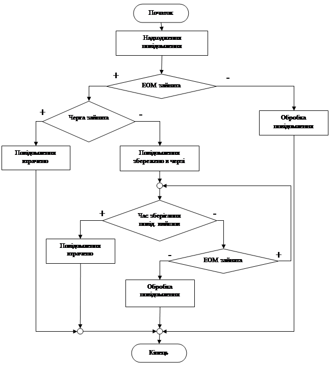 4 Опис імітаційної моделі процесу надходження повідомлень Імітаційне моделювання – моделювання, де система замінюється на її імітатор, і з ним проводяться досліди з метою отримання інформації про систему. Імітаційну модель процесу обробки повідомлень в ЕОМ можно представити у вигляді блок-схеми.Для цього спочатку виділимо основні етапи обробки повідомлення, щонадходить від датчиків пристроїв до ЕОМ: 1) Повідомлення надходить на ЕОМ. 2) Якщо ЕОМ вільна, то повідомлення обробляється. 3) Якщо ЕОМ зайнята, то виконується спроба поставити повідомлення до черги. 4) Якщо черга вільна, то повідомлення успішно поміщається до неї, щоб далі бути обробленим ЕОМ. 5) Вмикається лічильник часу, для відліку часу, що повідомлення знаходиться в черзі, якщо час більший ніж задано, то повідомлення втрачається. 6) Якщо час менший заданого, то повідомлення надходить до ЕОМ для обробки. 7) Якщо черга зайнята, то повідомлення втрачається. Розлянутий алгоритм обробки ЕОМ одного повідомлення представлено на рисунку 5.
