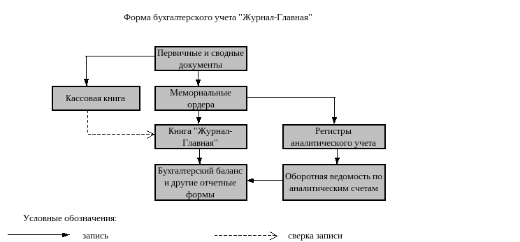 6 Лекция 5. Тема: Основные формы бухгалтерского учета.Под формами бухгалтерского учета понимается строение учетных регистров и их взаимосвязь, а также последовательность и способы учетной регистрации. Формы бухгалтерского учета постоянно совершенствуются по мере развития техники учета. Форма бухгалтерского учета определяется следующими признаками: количество, структура, внешний вид учетных регистров, последовательность связи между документами и регистрами, а также между самими регистрами и способами записи в них, т.е. использование тех или иных технических средств. Основными формами бухгалтерского учета являются: Мемориально-ордерная; Журнал-Главная; Журнально-ордерная; Автоматизированная форма с применением ЭВМ. 5.1. Мемориально-ордерная форма бухгалтерского учета. Одна из форм бухгалтерского учета, которая возникла в 1928-1930 гг. Данная форма является предшественницей современных форм. На основании первичных, сводных и накопительных документов составляют мемориальные ордера, которые регистрируются в регистрационном журнале. Затем на основании мемориальных ордеров производят записи по счетам синтетического учета в Главной книге. Документы, приложенные к мемориальным ордерам, служат основанием для записей в регистрах аналитического учета. В конце месяца составляют оборотную ведомость по счетам синтетического учета и оборотные ведомости по счетам аналитического учета и производят их взаимную сверку. При этом сопоставляют итоги оборотных ведомостей по аналитическим счетам с данными соответствующих синтетических счетов. Итоги оборотов по дебету и кредиту всех синтетических счетов, а также итог регистрационного журнала должны быть равны между собой. Главная книга Мемориальный ордер - это документ, в котором отражается бухгалтерская проводка. В нем указываются: номер ордера, месяц, год, содержание записи, суммы, наименование дебетуемого и кредитуемого счетов. Мемориальный ордер составляется на специальных бланках, и подписываются главным бухгалтером или его заместителем. К ним прилагаются определенные документы. Мемориально-ордерная форма бухгалтерского учета отличается строгой последовательностью учетного процесса, простотой и доступностью учетной техники, широким использованием стандартных форм аналитических регистров. Недостатками данной формы учета являются: Трудоемкость учета, вызываемая, прежде всего многократным дублированием одних и тех же записей (в мемориальном ордере, регистрационном журнале, синтетических и аналитических регистрах); Отрыв аналитического учета от синтетического, громоздкость аналитического учета, нередкое отставание его от синтетического учета; Формы регистров аналитического учета зачастую не содержат показателей, необходимых для контроля, анализа хозяйственной деятельности и составления отчетности. 5.2. Журнал-Главная форма бухгалтерского учета. Форма бухгалтерского учета Журнал-Главная является разновидностью мемориально-ордерной формы. Используется в небольших организациях.При этой форме учета на основании сгруппированных первичных, а также сводных (накопительных) документов составляют мемориальные ордера. Мемориальные ордера и приложенные к ним документы являются основанием для записей по счетам синтетического и аналитического учета. Синтетический уч