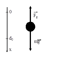 Иначе говоря, проекция ускорения прямо пропорциональна координате, причем коэффициент пропорциональности имеет отрицательный знак. Уравнение (1.17) является дифференциальным второго порядка, общая теория решения таких уравнений изучается в курсе математического анализа. Однако легко доказать непосредственной подстановкой, что функция гармонических колебаний (1.3) удовлетворяет уравнению (1.17). Как уже было доказано ранее, частота колебаний выражается формулой (1.9). Амплитуда A и начальная фаза j0 колебаний определяются из начальных условий. Пусть первоначально груз был смещен вправо от положения равновесия на расстояние d0, а начальная скорость груза равна нулю. Тогда используя функции (1.3) и (1.5), запишем для момента времени t=0 следующие уравнения: d0 =Acos(j0) (1.18) 0 = -wAsin(j0) (1. 19) Решением системы (1.18) – (1. 19) являются следующие значения A = d0 и j0= 0. Для других начальных условий величины A и j0, естественно приобретут другие значения. Теперь рассмотрим систему, изображенную на рис.1.8. б. На груз в этом случае действуют только две силы: сила тяжести mg и сила упругости F (см. рис.1.10). Ясно, что в положении равновесия эти силы компенсируют друг друга, следовательно, пружина растянута. Пусть груз несколько смещается по вертикали. Тогда векторное уравнение движение будет иметь вид, аналогичный уравнению (1.12) ma = mg – kd(1. 20) причем независимо от направления вертикального смещения (вверх или вниз). Все векторы в уравнении (1. 20) направлены вертикально, поэтому это уравнение целесообразно спроецировать на вертикальную ось координат. Направим ось вниз, а начало координат выберем в точке, где тело находится в состоянии равновесия (см. рис.1.10).