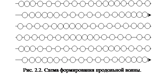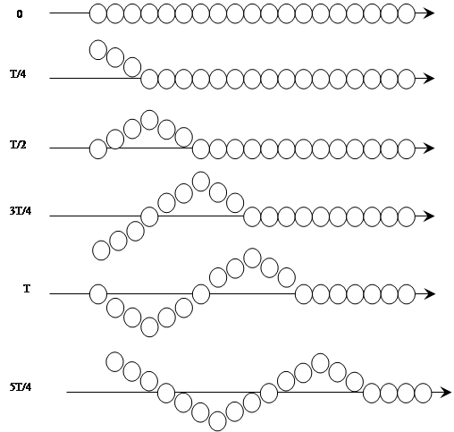Для того чтобы разобраться в свойствах волны, пренебрежем сопротивлением воздуха, вязкостью воды и воздуха, т.е. диссипативными силами. Тогда механическую энергию капелек воды можно полагать сохраняющейся. В этом случае движение волны схематически можно изобразить так, как показано на рисунке 1, заменив капельки воды пронумерованными шариками. Обозначим за поплавок шарик №1. Рис. 2.1. Схематичное изображение поперечной волны. Мы видим, что причиной движения является шарик №1, т.е. поплавок. Он с помощью взаимодействия вовлекает в движение шарик №2, шарик №2 вовлекает №3 шарик, и т.д. Но взаимодействие между частицами происходит не мгновенно, поэтому шарик №2 будет отставать по времени. Также можно заметить, что шарик №13 колеблется так же, как и №1. Тогда можно сделать вывод, что шарик №2 будет отставать от №1 на 1/12 периода. Отсюда периодом волны(T) можно назвать период колебаний шарика №1, амплитудой волны(A) – максимальное отклонение шарика от горизонтальной оси, а длиной волны (λ) – минимальное расстояние между максимумами ближайших горбов или минимумами ближайших впадин. В ранее рассмотренном примере волна распространялась перпендикулярно колебаниям источника, иначе говоря, была рассмотрена поперечная волна. Продольные волны – волны, распространяющиеся параллельно движению источника. Если рассматривать продольные волны схематически (рис.2.2), то можно заметить, что с течением времени источник колебаний (шар №1) колеблется влево-вправо и вовлекает в такое же колебательное движение остальные частички. Тогда, для продольной волны, определение периода волны, описанное выше, останется неизменным, а определения длины волны и амплитуды будут выглядеть иначе. Обобщенные понятия будут выглядеть так: длина волны – минимальное расстояние между шариками, двигающихся с одинаковыми фазами; амплитуда волны – максимальное отклонение от положения равновесия.