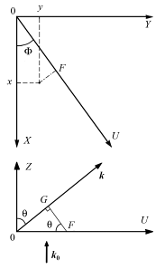 с точностью до аппаратурного коэффициента (сомножителя, определяемого характеристиками регистрирующей аппаратуры). Интенсивность (3.31) является функцией полярного угла q и описывает в плоскости xoz угловое распределение рентгеновских лучей, рассеянных цепочкой атомов, расположенных вдоль оси ox. Теперь рассмотрим рассеяние рентгеновских лучей на конечном множестве атомов, находящихся в одной плоскости. Пусть на эту систему атомов падает плоская рентгеновская волна с волновым вектором k0, перпендикулярным плоскости атомов. Свяжем с данной физической системой оси декартовых координат. Ось oz направим вдоль вектора k0, а оси ox и oY расположим в плоскости атомов. Положение каждого атома задается двумя координатами xj и yj, где j = 0, … N – 1. Пусть начало координат совмещено с центром одного из атомов, который имеет номер j = 0. Рассмотрим рассеяние рентгеновских лучей в полупространство z > 0. При этом можно полагать, что детектор перемещается по полусфере определенного радиуса R, который много больше размера облучаемого образца. Направление на детектор в условиях дифракции Фраунгофера совпадает с волновыми векторами k рассеянных волн, приходящих во входное окно детектора. Это направление характеризуется двумя углами: полярным q, который откладывается от оси oz (как на рис.3.9 и 3.10), и азимутом Ф, который отсчитывается от оси ox в плоскости xoY (см. рис.3.10). Иначе говоря, q - угол между волновыми векторами первичной k0 и рассеянной k волн. Азимут Ф представляет собой угол между осью OX и проекцией вектора k на плоскость XOY. Как и предыдущем случае одномерной цепочки атомов, амплитуда суммарного колебания, регистрируемая детектором определяется относительными сдвигами фаз когерентных волн, рассеянных отдельными атомами. Сдвиг фаз рассеянных волн связан с разностью хода соотношением (3.24), как и в выше рассмотренном случае. Найдем разность хода между волнами, рассеянными атомами с координатами (x0=0, y0=0) и (x, y) в направлении, заданном волновым вектором k (т.е. определенными углами q и Ф). Проведем вспомогательную ось OU вдоль проекции вектора k на плоскость XOY(см. рис.3.10).