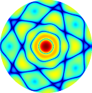 Внутренние интегралы берутся по диапазону азимутального угла ФÎ [0, 2π], а внешние интегралы по диапазону полярного угла qÎ [0, π/2]. Следует обратить внимание на некоторые важные особенности всех дифракционных картин. На рис.4.1. видно, что в центре полярной диаграммы находится центральный максимум интенсивности рассеянного излучения. Этот максимум имеет высокую симметрию, близкую к симметрии предельной группы С¥. В угловом распределении рассеянного излучения центральный максимум занимает некоторый интервал полярных углов qÎ [0, qC]. Полуширина центрального максимума существенно зависит от длины волны рентгеновских лучей l и количества рассеивающих атомов. Также весьма важно, что интенсивность центрального максимума значительно превышает интенсивность всех остальных точек двумерного угловом распределении рассеянного рентгеновского излучения. Напротив, с ростом полярного угла интенсивность рассеянного излучения в среднем резко падает. Это означает, что периферийная область дифракционной картины (область полярных углов превышающих некоторое значение qM) практически не влияет на величину коэффициента поворотной псевдосимметрии (4.2). Как следствие, в степень инвариантности (4.2) основной вклад дает центральный максимум. Иначе говоря, высокая симметрия центрального максимума подавляет симметрийные особенности всех остальных характерных особенностей дифракционной картины. Для детального исследования поворотной псевдосимметрии угловом распределении рассеянного рентгеновского излучения целесообразно вычислять функционалы следующего вида: