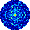 аб Рис.4.5. Дифракционная картина рентгеновских лучей, рассеянных фрагментом гранецентрированной кубической решетки, содержащей в узлах молекулы фуллерена C60. Рассеивающий фрагмент содержит 14 молекул фуллерена C60. Длина волны рентгеновского излучения а) l = 1,54 Å, б) l = 0,71 Å. Оси симметрии 5-го порядка молекул C60 параллельны волновому вектору k0 первичной рентгеновской волны. Легко видеть, что дифракционные картины рентгеновских лучей, рассеянных фрагментами кристаллов, вообще говоря, теряют поворотную симметрию свойственную отдельным молекулам или атомным кластерам. Для исследования симметрийных особенностей дифракционных картин типа представленных на рис.4.3. – 4.5. целесообразно использовать расчеты поворотной псевдосимметрии. 3.1.3. Псевдосимметрия дифракционных картин рассеяния рентгеновских лучей на фрагментах кристаллов фулеритовСогласно методике, изложенной в предыдущем разделе, были проведены анализ степени инвариантности дифракционных картин, полученных при рассеянии рентгеновских лучей на молекулах фуллеренов С60 и на фрагментах кристаллов фулеридов. Расчеты коэффициентов псевдосимметрии проводились отдельно для поддиапазонов полярного угла шириной dq = 5° (5 угловых градусов). Вычисления были сделаны для двух различных длин волн первичного рентгеновского излучения l = 0,71 Å и l = 1,54 Å, что соответствует характеристическим линиям К-альфа молибдена и меди. Степень инвариантности дифракционных картин была рассчитаны, в первую очередь, для порядков поворота n = 2, 3, 4, 5; иначе говоря, для углов поворота полярной диаграммы an = 180°, 120°, 90°, 72°. Пример полученных результатов приведен на рис.4.2. Рис.4.2. Гистограмма коэффициентов поворотной псевдосимметрии дифракционных картин, полученных при рассеянии рентгеновских лучей с диной волны l = 0,71 на молекуле фуллерена С60. По вертикали отложены значения степени инвариантности ha, по горизонтали – порядковые номера поддиапазонов полярного угла шириной dq = 5°. Ось симметрии 5-го порядка молекулы C60 параллельна волновому вектору k0 первичной рентгеновской волны. На рис.4.2. видно, что коэффициент поворотной псевдосимметрии равен единице во всех поддиапазонах полярного угла. Если порядок поворота дифракционной картины совпадает с порядком оси симметрии облучаемого объекта, вдоль которой направлен волновой вектор k0 первичной рентгеновской волны. Это характерная особенность наблюдается для атомных кластеров любой точечной симметрии. Кристаллы фуллеридов состоят из отдельных молекул фуллеренов (рис.4.3), которые образуют трансляционно упорядоченную пространственную структуру. Рис. 4.3. Молекула фуллерена В настоящей работе были проведены расчеты коэффициентов поворотной псевдосимметрии дифракционных картин, формируемых при рассеянии рентгеновских лучей на небольших кубических фрагментов кристаллов, состоящих из молекул фуллеренов С60. На рис.4.4. – 4.5. приведены сравнительные гистограммы поворотной псевдосимметрии дифракционных картин для порядков поворота n = 4 и n = 5, полученных при рассеянии рентгеновских лучей на кристаллических фрагментах, содержащих различное количество молекул С60 (и следовательно, различное число атомов). Для сравнения на рис.4.4. представлены гистограммы для одной молекулы фуллерена С60, рассчитанные при идентичных условиях и параметрах.
