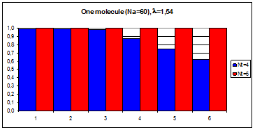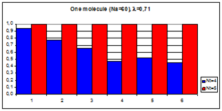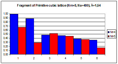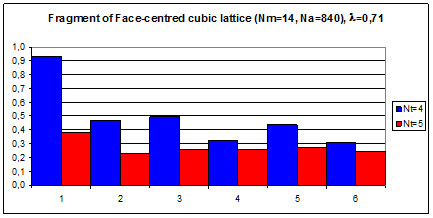 б Рис.4.6. Гистограммы коэффициентов поворотной псевдосимметрии дифракционных картин, полученных при рассеянии рентгеновских лучей с длиной волны l = 0,71 Å на фрагменте кубической гранецентрированной решетки, в узлах которой расположены молекулы фуллерена С60. По вертикали отложены значения степени инвариантности ha, по горизонтали – порядковые номера поддиапазонов полярного угла шириной dq = 15°. Оси симметрии 5-го порядка молекул C60 параллельны волновому вектору k0 первичной рентгеновской волны. Число молекул фрагмента а) NМ = 14, б) NМ = 63. Сравнение рисунков 4.4. и 4.5, а также 4.4. и 4.6. ясно демонстрирует, что с увеличением количества молекул (и атомов) в кристаллическом фрагменте величина коэффициента поворотной псевдосимметрии 5-го порядка уменьшается во всех поддиапазонах полярного угла. Это объясняется тем, что кубические фрагменты структуры трансляционно упорядоченных молекул фуллерена не обладают поворотной симметрией 5-го порядка. С другой стороны, на рис.4.4. - 4.6. видно, что с ростом количества молекул увеличивается коэффициент поворотной псевдосимметрии 4-го порядка из-за возрастания количества рассеивающих объектов, находящихся в узлах примитивной кубической кристаллической решетки. Таким образом, в дифракционных картинах точечная симметрия кристаллической решетки превалирует над точечная симметрией отдельных атомных кластеров, расположенных в узлах решетки, даже если все кластеры имеют одинаковую ориентацию. Указанные тенденции наблюдаются на фрагментах как примитивной, так и гранецентрированной кубической кристаллической решетки. Далее приводятся результаты аналогичных расчетов коэффициента поворотной псевдосимметрии для длины волны рентгеновского излучения l = 1,54 Å.