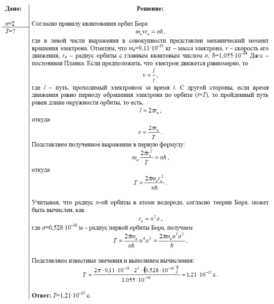 Ответ : 1,4х10-19 Дж. ТЕМА "Квантовая механика. Строение атома и ядра" 803. Вычислить по теории Бора период Т вращения электрона в атоме водорода, находящегося в возбужденном состоянии, определяемом главным квантовым числом n = 2.