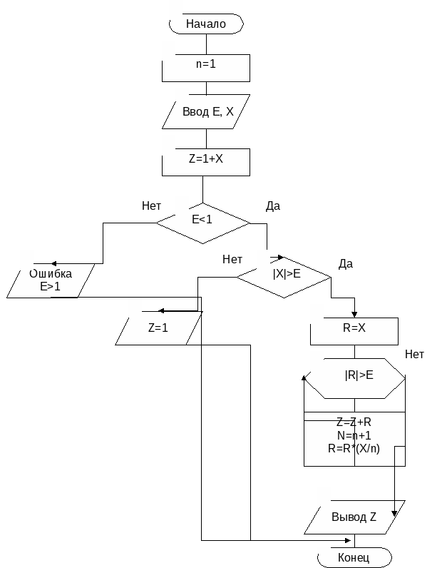#include<iostream.h> #include<math.h> #include<conio.h> void main() { int n=1; double e,x,r,z; clrscr(); cout<<"Input X:\t"; cin>>x; cout<<"Input E:\t"; cin>>e; z=1+x; if (1>e) { if (fabs(x)>e) { r=x; while (fabs(r)>e) { z+=r; n++; r*=x/n; } cout<<"Z= \t\t"<<z<<endl; } else cout<<"Z=\t\t1"<<endl; } else cout<<"\nОшибка ввода: E>1"<<endl; }