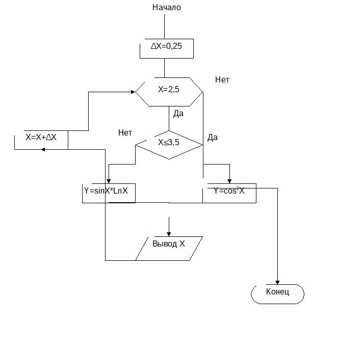 Program lab_2; Uses Crt; Const Var x,y:real; Begin clrscr; x:=2.0; while x<5.0+dx/2 do begin if x<=3.5 then begin y:=sqr(cos(x)); end else y:=sin(x)*ln(x); writeln(y:3:5); x:=x+dx; end; readln; End.