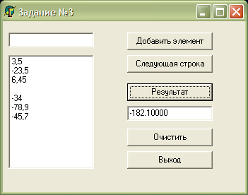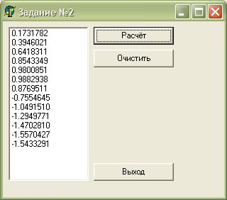 unit Unit1; interface uses Windows, Messages, SysUtils, Classes, Graphics, Controls, Forms, Dialogs, StdCtrls; type TForm1 = class(TForm) ListBox1: TListBox; Button1: TButton; Button2: TButton; Button3: TButton; procedure Button2Click(Sender: TObject); procedure Button1Click(Sender: TObject); procedure Button3Click(Sender: TObject); private { Private declarations } public { Public declarations } end; Const dx=0.25; var Form1: TForm1; implementation {$R *.DFM} procedure TForm1.Button2Click(Sender: TObject); begin Close(); end; procedure TForm1.Button1Click(Sender: TObject); var Code:integer; x,y:real; s:string[11]; begin x:=2.0; while (x<5.0+0.5*dx) do begin if x<=3.5 then y:=sqr(cos(x)) else y:=sin(x)*ln(x); x:=x+dx; Str(y:2:7,s); Listbox1.Items.Add(s); end; end; procedure TForm1.Button3Click(Sender: TObject); begin Listbox1.Items.Clear; end; end.