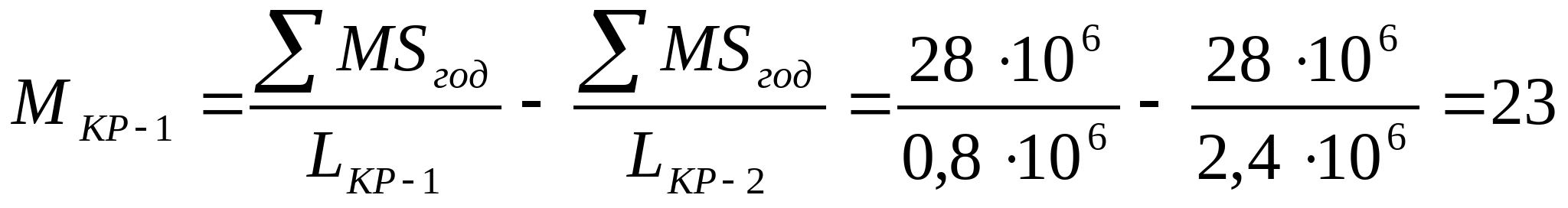 Годовой пробег электровозов ЧС-7 согласно задания МSгод = 28 млн. км Исходя из общего пробега электровозов и межремонтных пробегов, рассчитываю плановую годовую программу ремонта локомотивов в депо по формуле: где Mi – количество ремонтов соответствующего объёма; Li – пробег между соответствующими видами ремонта; Li+1 – пробег между видом ремонта на порядок выше определяемого. Рассчитываю годовую программу ремонта: Определяю программу капитального ремонта КР-2: