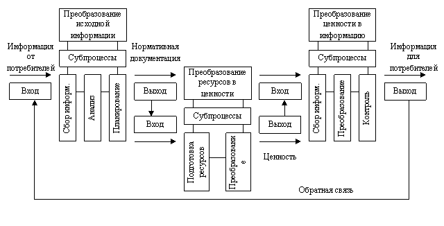 Общая логика построения основного процесса заключается в последовательном уменьшении энтропии о внешней и внутренней среде предприятия для принятия управленческих решений: сборе, детализации и преобразовании полученной информации в форму, необходимую для материального преобразования ценности, доведении информации до потребителей и проверки расхождения произведенной и фактической ценности для потребителя. Выделение преобразования информации в самостоятельный процесс является ключевым моментом для понимания глубинной сущности маркетинга как концепции управления. Формализация данных процессов обуславливает необходимость их распределения по стадиям управленческого цикла.