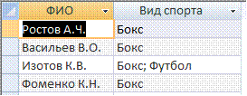SELECT Спортсмен.ФИО, Спортсмен.[Вид спорта] FROM Спортсмен WHERE [Вид спорта].Value="Бокс";