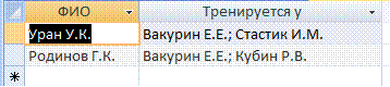 SELECT Спортсмен.ФИО, Спортсмен.[Тренируется у] FROM Спортсмен WHERE Спортсмен.[Тренируется у].Value="Вакурин Е.Е.";