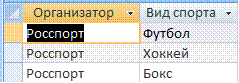 SELECT Соревнование.Организатор, Соревнование.[Вид спорта] FROM Соревнование WHERE Соревнование.Организатор="Росспорт";