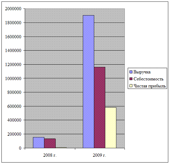 Рис. 3.2. Изменение статей отчета о прибылях и убытках в 2009 г. Таким образом, при увеличении суммы выручки предприятию удается увеличить сумму чистой прибыли на 575087 тыс. руб., что подтверждает эффективность предложенных мероприятий. Также рассмотрим соотношение между выручкой, себестоимостью и прибылью на рис. 3.3.