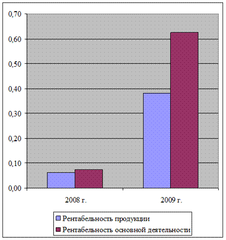 Согласно данным таблицы 3.4 на анализируемом предприятии наблюдается увеличение всех показателей рентабельности. Охарактеризуем изменение каждого показателя в отдельности: - коэффициент рентабельности продукции свидетельствует, что в 2008 г. на рубль стоимости реализованной продукции приходилось 6 коп. прибыли, в 2009 г. в результате применения предложенных мероприятий размер прибыли на рубль продаж составил 38 коп., т.е. увеличение составило 32 коп.. - показатель рентабельности основной деятельности позволяет сравнить эффективность затрат на основной вид деятельности и на другие ее виды. Он показывает удельный вес прибыли от реализации в каждом рубле себестоимости реализованной продукции, служит характеристикой эффективности управления и правильности выбранной стратегии. Его значение в 2008 г. 7 коп. прибыли, в 2009 г. – увеличивается на 55 коп. и составляет 63 коп. Наглядно динамику основных показателей рентабельности изобразим на рис. 3.5.