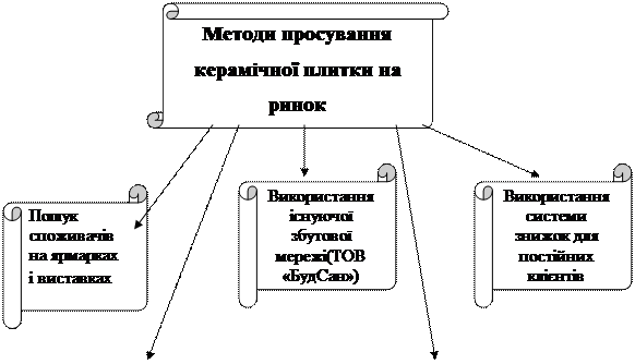 Рисунок 11.1 – Стратегічне дерево цілей підприємства ТОВ «Кераміка» Слід додати, що встановлення цілей у маркетинговому стратегічному плануванні пов'язане перш за все з реалізацією напрямів діяльності у привабливих галузях, конкурентним становищем на ринку та сприйняття його споживачами. 12. Поточна маркетингова ситуація, програма дій та контроль підприємства План маркетингу показує, які дії підприємство ТОВ «Кераміка» має вчинити, чому вони необхідні, хто відповідає за їх реалізацію, де вони будуть здійснені і як будуть завершені. Цей план визначає поточний стан підприємства, його майбутню орієнтацію і розподіл ресурсів. Стратегічний план маркетингу підприємства містить наступні розділи: 1. Продуктовий план. На даний момент підприємство має наступний асортимент продукції: - кахлі камінні, - плитка керамічна оздоблювальна, - плитка керамічна для підлоги, - плитка керамічна тротуарна. Найбільший обсяг реалізації припадає на кахлі камінні. В майбутньому підприємство планує розпочати виробництво керамічної сантехніки. 2. План дослідження і розроблення нових продуктів. Завдяки придбанню високотехнологічного обладнання – ротаційних друкарських машини суттєво покращиться якість та асортимент готової продукції. Ротаційні машини також дозволять підприємству виготовляти плитку різноманітних форматів, а саме 200*500 мм та 333*500 мм. Нещодавно підприємство почало виробництво керамічної плитки з малюнками в українському стилі. 3. План рекламної роботи та стимулювання збуту. Підприємство планує провести масштабну рекламну кампанію та організувати промо-акцію для збільшення обсягів реалізації керамічної плитки. 4. План функціонування каналів розподілу. Стосовно методів просування продукції на ринок та формування каналів розповсюдження, то воно здійснюватиметься шляхом (ри.12.1):