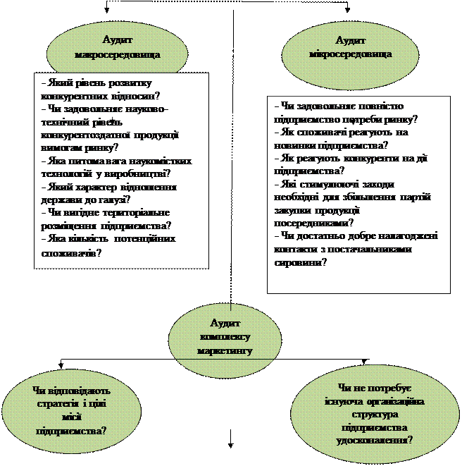 Таким чином, кінцевий строк проведення рекламної кампанії 23 лютого, а аналіз ефективності такого роду кампанії буде проводитися з 24 по 28 лютого. 15. Аналіз маркетингового аудиту у маркетинговій галузі (політика ціноутворення) підприємства Метою маркетингового аудиту є виявлення ділянок, де існують проблеми й нові можливості, та розроблення рекомендацій щодо формування плану підвищення ефективності маркетингової діяльності. Зробимо аналіз маркетингового аудиту щодо політики ціноутворення за наступними напрямами: 1. Цілі ціноутворення. Забезпечення збуту продукції – головна мета підприємства. Ця мета реалізується за рахунок зменшення ціни за одиницю товару. Цю мету підприємство обрало, тому що ціновий попит споживачів еластичний; а також підприємство бажає домогтися максимального зростання збуту і збільшення загального прибутку шляхом деякого зниження доходу з кожної одиниці товару; підприємство припускає, що збільшення обсягу реалізації скоротить відносні витрати виробництва і збуту. 2. Методи ціноутворення. Метод визначення ціни на керамічну плитку на основі повних витрат і передбачає встановлення єдиної оптової ціни у всіх регіонах. Прагнення підприємства утримувати рівень оптових цін на керамічну плитку трохи нижчим за аналогічну продукцію конкурентів. Але підприємство ніяким чином не може впливати на рівень цін на свою продукцію в роздрібних магазинах керамічної плитки. 3. Стратегія ціноутворення. Підприємство ТОВ «Кераміка» використовує стратегія ціноутворення - стратегія цін, встановлених нижче, ніж у більшості фірм. Ця стратегія оптимальна на даний момент, тому що підприємство ще не досить добре закріпилося на ринку. Тому, якість керамічної плитки буде висока, але ціна значно нижча, ніж у конкурентів. Дана стратегія відповідає цілям, які підприємству ТОВ «Кераміка» необхідно досягнути. Таким чином, можна зробити висновок, що в результаті проведення аналізу маркетингового аудиту суттєвих помилок у політиці ціноутворення підприємства не виявлено, але можна дати рекомендацію, що для більш ефективного функціонування на ринку керамічної плитки підприємству ТОВ «Кераміка» необхідно удосконалити організаційну структуру підприємства та назначити контролерів за реалізацією стратегії ціноутворення. Відділ маркетингу повинен постійно аналізувати та слідкувати за політикою основних конкурентів підприємства, таких як «Кармен», «Бест Лайн», «Маккор» та ін.. 16. Перелік питань, на які потрібно відповісти під час проведення зовнішнього і внутрішнього аудиту Розробимо перелік питань, на які необхідно відповісти під час проведення зовнішнього і внутрішнього аудиту, використовуючи при цьому схему напрямків маркетингового аудиту (рис.16.1).