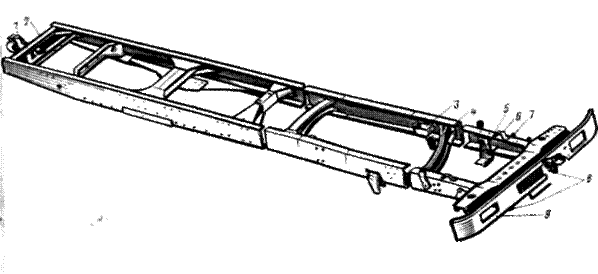 Рама автомобиля КамАЗ-5320: 1— тягово- сцепное устройство, 2 — задняя поперечина, 3 – кронштейн задней опоры двигателя, 4 — задний кронштейн передней подвески, 5 —кронштейн передней опоры двигателя, 6 — скоба подвески радиатора, 7 —передний кронштейн передней подвески; 8 — буксирные крюки; 9 —переднийбуфер. 2.2 Типы рам их сравнение и применение Рамы по конструкции делятся на лонжеронные, центральные ( хребтовые ) и Х образные ( смешанные ). А) Лонжеронные рама - состоит из двух продольных балок (лонжеронов) 1, соединенных при помощи сварки или заклепок поперечинами (траверсами) 2. Лонжероны и траверсы штампуются из листовой стали и имеют П—сечение. Высота лонжеронов в средней части как более нагруженной увеличена. Лонжеронные рамы применяют на большинстве грузовых автомобилей. Б) Хребтовая рама – состоит из центральной балки с поперечинами. Балка может иметь трубчатое, швеллерное или коробчатое сечение. Хребтовые рамы на автомобилях применяют редко. В) Х-образная рама -- состоит из средней балки, имеющей закрытый трубчатый профиль, передней и задней вильчатых частей. Рамы этой конструкции применяют на легковых автомобилях большой вместимости. Многие легковые автомобили и автобусы имеют безрамную конструкцию – роль рамы выполняет несущий кузов. В этом случае днище кузова изготавливают достаточно жёстким, а в местах крепления узлов и агрегатов его усиливают накладками жёсткости. Для крепления двигателя, передней подвески и рулевое управления имеется подрамник, приваренный к днищу кузова.